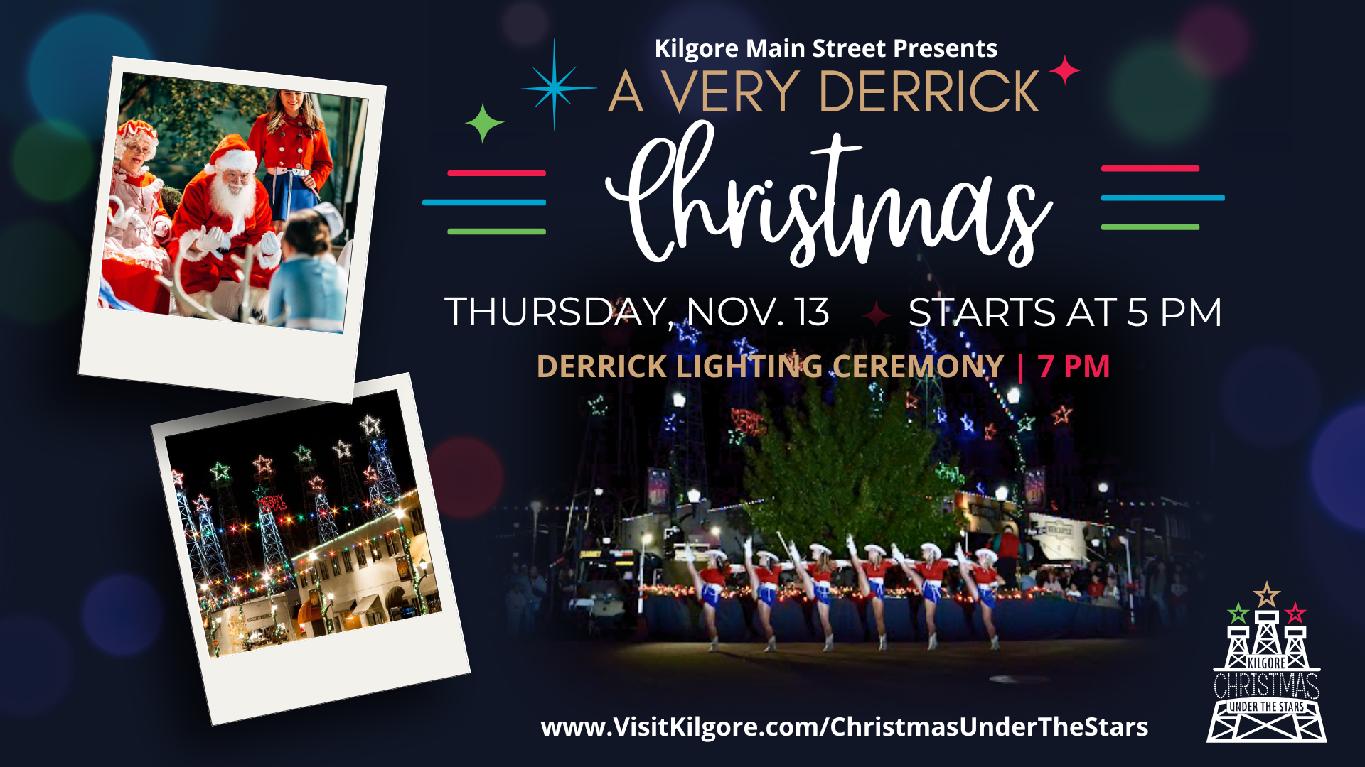Discover Christmas under the bright stars of Kilgore, Texas, this holiday season. Located in the Piney Woods just two hours east of Dallas, Kilgore kick starts the holiday season with a tradition unlike anything else here in Texas. Each Christmas season, the stars atop the oil derricks in Kilgore are lit, creating a magically bright and colorful display in Historic Downtown Kilgore at A Very Derrick Christmas. One of Kilgore’s seasonal favorites, this event includes the annual lighting of the derricks ceremony, shopping at the Kris Kringle Market, along with games and activities. This year’s theme is having fun with games and activities with the theme “Christmas In The Oil Patch.