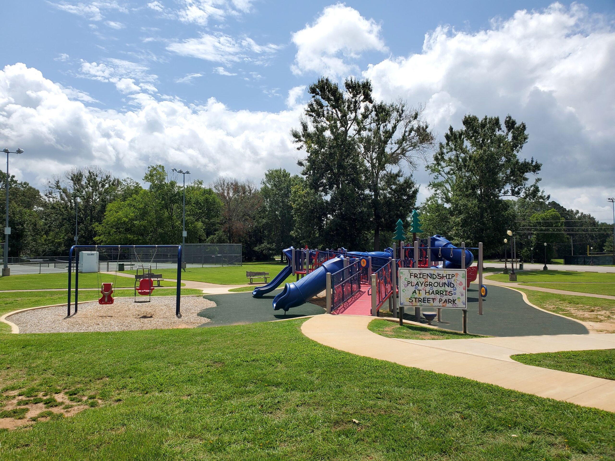 Harris Street Park and Friendship Playground feature a pavilion, picnic tables, playground, restrooms, tennis court and walking trail.